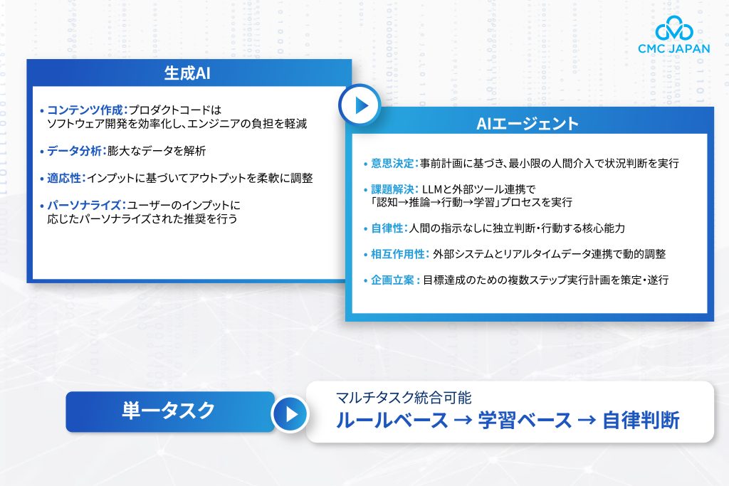 レガシーシステム刷新の文脈において、生成AIは「ツール」としての効率化を担い、AIエージェントは「自律的な実行主体」としてプロセス全体を推進します