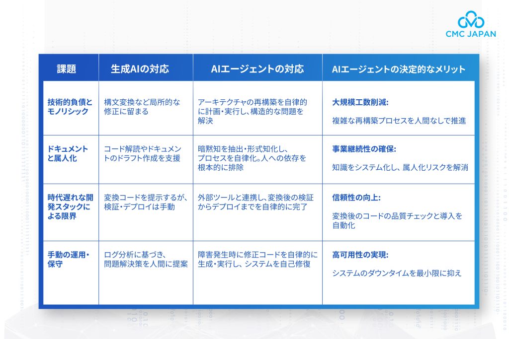 生成AIは「作業の効率化」という水平的な貢献に留まるのに対し、AIエージェントは「自律的な実行」という垂直的な深さを持ちます。この自律的な能力こそが、レガシーシステム刷新における大規模な工数削減、品質向上、そして事業継続性の確保という決定的なメリットをもたらします