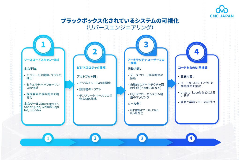 AIエージェントは、このリバースエンジニアリングのプロセスを、以下の4つの主要なステップで自律的に実行することで、手動では不可能だった迅速かつ正確なシステム移行を可能にします。