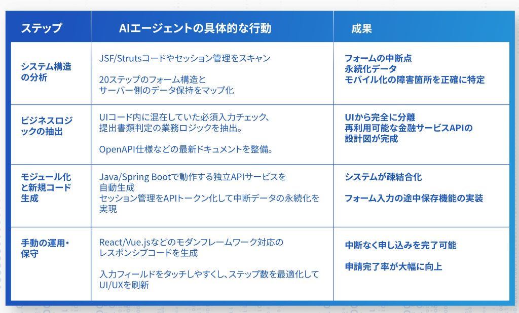 そしてAIエージェントは、この「顧客体験のボトルネック」となっているレガシーシステムに対し、以下のプロセスを自律的に実行し、システムの最新化とモバイル対応を同時に実現します。