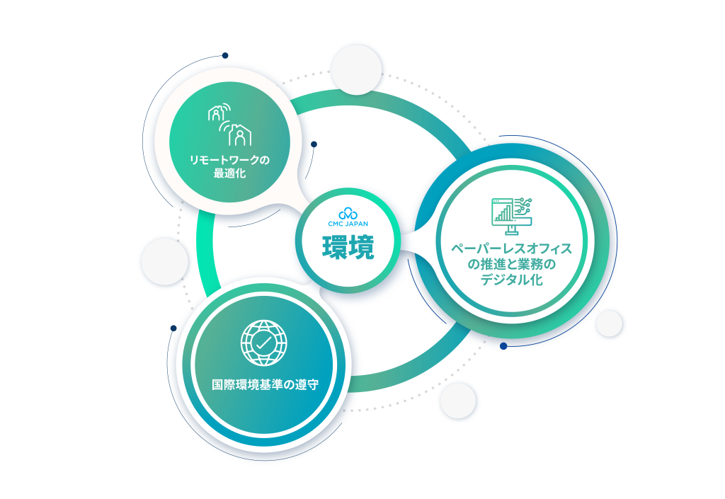 CMC Japanは、テクノロジーの活用と業務プロセスの最適化を通じて環境負荷の削減に取り組んでいます。社内のデジタル化、省エネルギーの活用、環境管理基準の導入を推進し、持続可能な企業運営を目指しています。