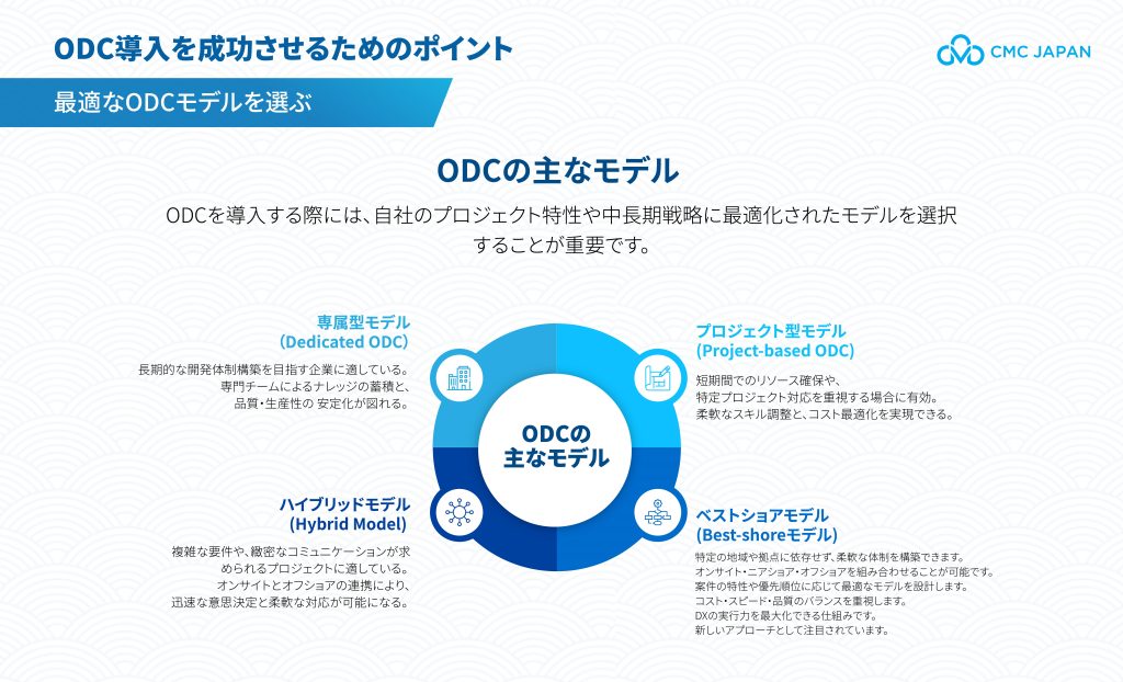 コストやリソースの優位性を最大限に活かすためには、プロジェクト特性や中長期的な開発方針を踏まえたうえで、適切なモデルを選ぶことが不可欠です。ここでは代表的な4つのODCモデルについて整理します。