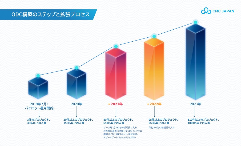 CMC Japan自身も、2019年時点の約30名体制から現在では1,000名規模へと拡大し、複数の大型プロジェクトに対応できる体制を構築しています。