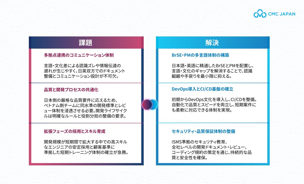 CMC Japanでは、こうした課題を前提とした運営設計を行い、日本企業の品質基準に対応できる体制を構築しています。